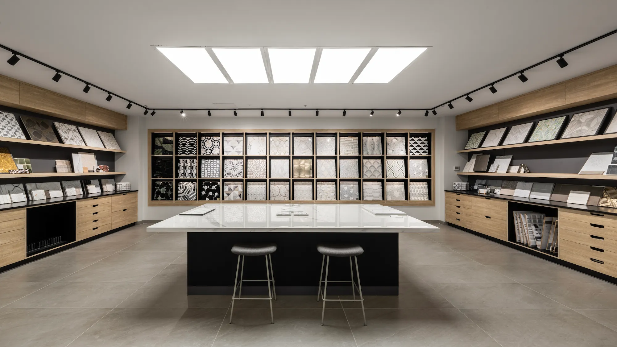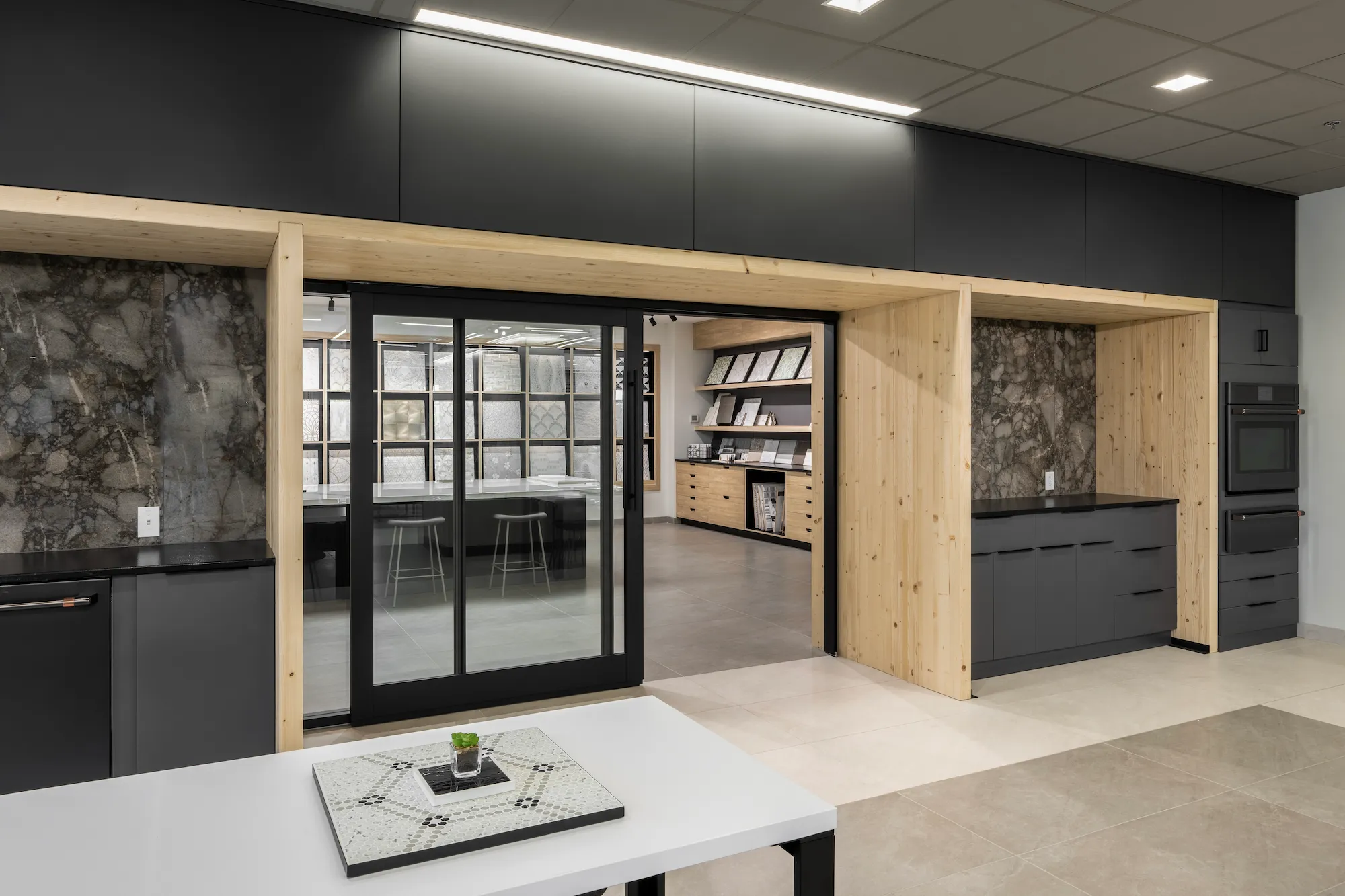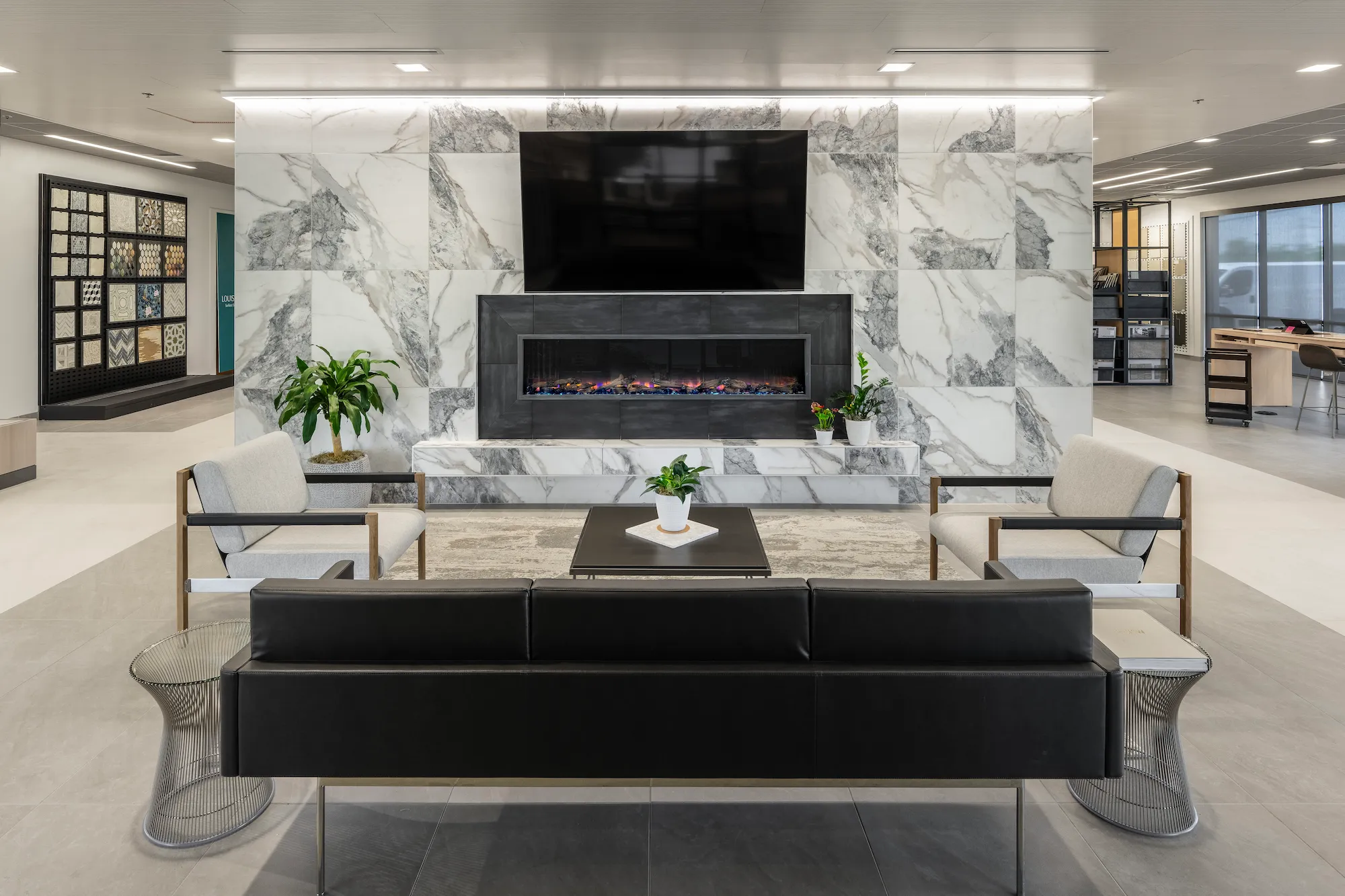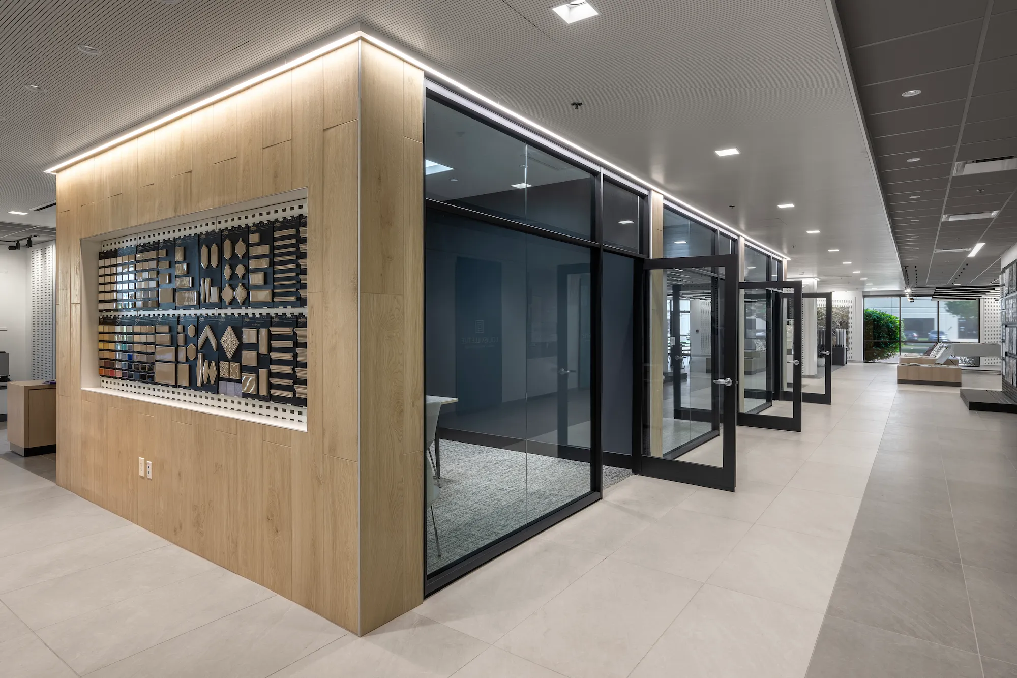 The Louisville Tile project involved an interior fit-out for their Cincinnati-area showroom, warehouse, and contractor’s pro shop, spanning just under 26,000 square feet. Completed within an eight-month timeframe, the project also incorporated a conference room, restrooms, and dedicated customer meeting rooms within the showroom. The showroom is designed to highlight Louisville Tile’s premium products, featuring a range of display types and sample applications to help customers envision how the tile would enhance their own spaces.